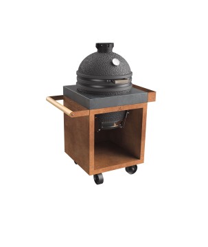La base está hecha de acero resistente a la intemperie. Gracias a un proceso químico, el acero Corten dispone de una capa protectora en su superficie que aumenta su resistencia a la corrosión atmosférica comparado con otros aceros. La capa natural de corrosión protege contra la perforación por oxidación. La encimera está hecha en hormigón, por lo que no es necesario guardar este modelo de la mesa para kamado dentro o en una zona cubierta.
