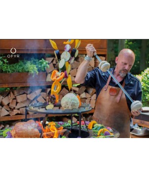 Convierta su unidad de cocina en una barbacoa brasileña con les accesorios de la parrilla brasileña OFYR. El anillo para brochetas horizontales 100 OFYR está disponible como producto independiente y debe utilizarse en combinación con el soporte de la parrilla Grill Round 100 OFYR para preparar todo tipo de alimentos.