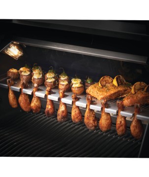 El práctico soporte multifuncional de acero inoxidable de alta calidad de Napoleon es compatible con el modelo de la barbacoa Rogue 525 de Napoleon y se utiliza en lugar de la rejilla de precalentamiento. El soporte amplia la superficie de cocción y se puede utilizar para colgar muslos o alitas de pollo, para cocinar verduras, setas rellenas, etc.