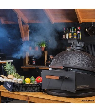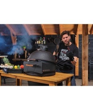 El accesorio Bastard Rotisserie - Pizza (Large) se puede utilizar como asador y como horno de pizza. La práctica puerta en la parte delantera mantiene la cúpula cerrada, lo que le permite avivar el fuego y retener el calor. El horno asador viene con una gruesa piedra para pizza hecha a medida. Esto lo convierte en el accesorio de pizza ideal para tu Bastard. El asador extraíble tiene un motor fuerte y garras grandes.