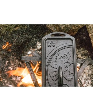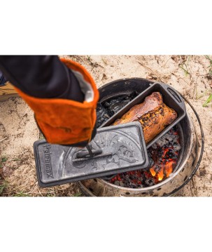 Hecho de hierro fundido, este material distribuye y almacena el calor de manera sobresaliente. El calor creado es impresionante tanto en el horno en casa y al cocinar al aire libre. Puedes usarlo directamente sobre el fuego o con briquetas en la tapa.