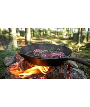 La sartén grill de Petromax es ideal para cocinar, hornear, estofar y freír. La sartén se puede utilizar en el horno, sobre su cocina de gas, en cocinas eléctricas. También funciona muy bien al aire libre en una hoguera o en una barbacoa adecuada. La superficie de la sartén no solo deja el típico sabor a parrilla en su alimento, sino que también proporciona un tostado bajo en grasa, ya que la carne y sus acompañantes se sostienen en las crestas y el exceso de grasa se puede drenar.