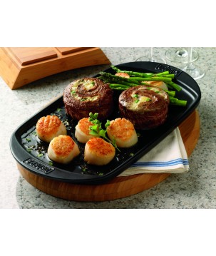 Cette plancha permet la cuisson de mets délicats tels que le poisson, les marinades... en saisissant les aliments. Elle peut aussi être utilisée comme plat de service en fin de cuisson pour garder au chaud vos aliments. Très pratique, la plancha se passe au lave-vaisselle.