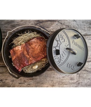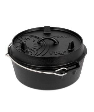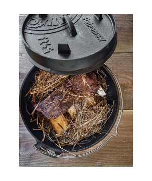 Grâce aux incroyables caractéristiques de la fonte et à la structure de surface spéciale, la chaleur est stockée et distribuée efficacement. La surface prétraitée (finition assaisonnée) rend inutile un assaisonnement initial et le four robuste peut être utilisé immédiatement. À l'extérieur, il est utilisé dans un feu de camp ou avec du charbon de bois et des briquettes. Le bord surélevé du couvercle vous permet également de placer des charbons ou des braises dans le four hollandais. Le four hollandais devient chaud de tous les côtés et convient, par exemple, à la cuisson du pain.