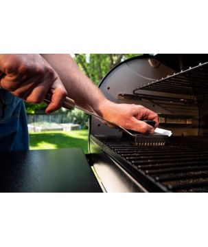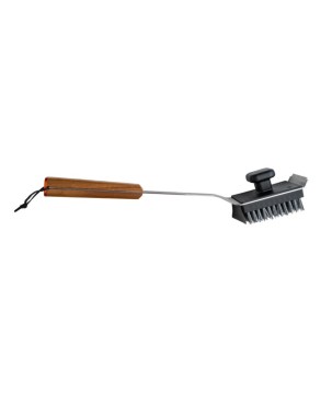 La brosse de nettoyage Traeger est en acier inoxydable revêtu de titane. Dispose d'un manche en bois de teck avec une boucle pour accrocher. Brosse à poils en nylon durable conçue pour nettoyer les grilles de barbecue froides. Poignée à double prise.