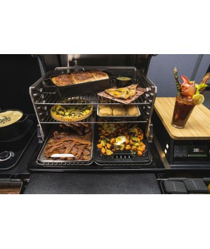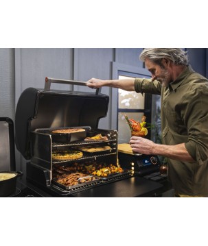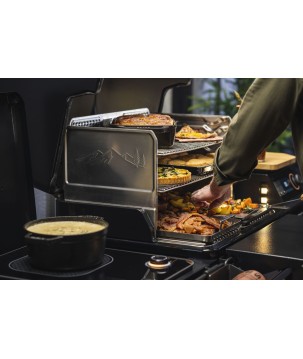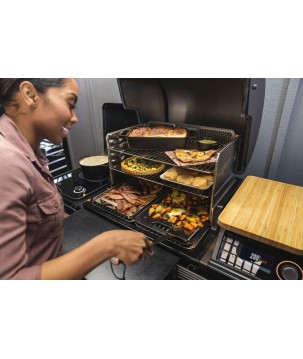 - Échappement Traeger DOWNDRAFT EXHAUST® - Distribue la fumée pour un maximum de saveur inégalée de combustion du bois - Grilles de cuisson en acier inoxydable réglables à 3 niveaux