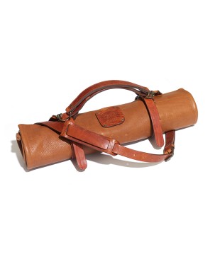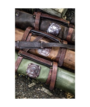 Just fill the knife roll with your knives and roll up. Close the knife roll with the two buckles, that are attached to the body. Once rolled up and closed the knife roll can be worn crossbody or by hand. The long shoulderstrap can also be detached from the handheld. Along with the knife roll you’ll receive 9 knife sleeves in different sizes. These prevent your knives from sliding through the leather and, even more important, they protect the knives.