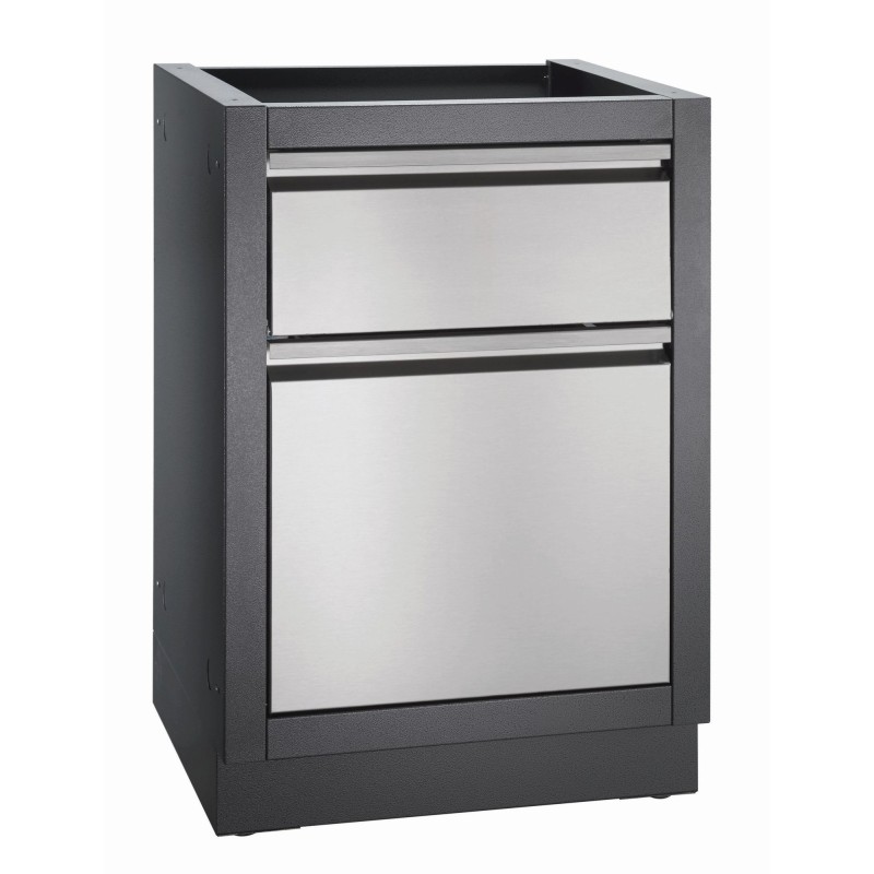 Things can get messy even in the perfect kitchen. Make cleaning up your outdoor kitchen OASIS™ easy with the OASIS™ Waste Drawer Cabinet. Featuring a garbage pull out with a removable waste bin, and a flip down drawer with paper towel holder. This Carbon colored, powder coated, galvanneal cabinet features increased durability from the two-coat pebbling, finishing system and stainless steel door and drawer front. Installation is a breeze with knockouts for gas and electrical. Levelling feet ensure a balanced surface, even if your patio isn't perfectly level. Add this cabinet to the perfect outdoor kitchen OASIS™, along with your choice of grill head and under grill cabinet. *Countertop not included