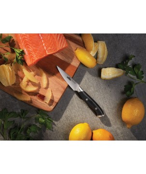 No kitchen is complete without a paring knife and Napoleon's 9 cm Paring Knife will make the perfect addition to your knife block. The forged German stainless steel runs the full length of the knife making it well balanced from the tip to the tang. The dual riveted handle provides comfort and ease of grip. A good Paring Knife is ideal for when control is paramount. Its small stature makes it easy to maneuver and features a plain edge with a sharply pointed tip that is ideal for peeling fruits and vegetables or deveining shrimp. This comfortable and sturdy knife is perfect for everyday use and especially where finesse is required.