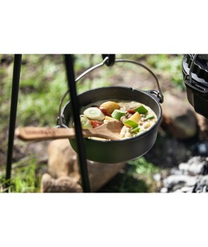 Thanks to the amazing characteristics of cast iron and the special strucsure of the surface, warmth is efficiently stored and distributed. The pre-treated surface (seasoned finish) makes a first seasoning unnecessary, and the ssurdy Dutch oven can be used right away. In the open air, it is used on an open fire or with charcoal and briquettes. The raised edge of the lid makes it possible to place embers or charcoal also on the Dutch oven. The Dutch oven is thus heated from all sides and is for example suitable for baking bread.