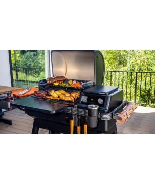 The all-natural hardwood pellets are moved from the hopper to the fire pot by an auger, where they are ignited by the HotRod to feed the flames and add delicious wood-fired flavour to your food. A fan circulates heat and smoke for even, consistent cooking, and a drip tray protects your food from the flames whilst preventing flare ups. This is all operated by a controller that maintains a precise temperature, so you can spend more time with the people who matter most, and less time watching the barbecue.