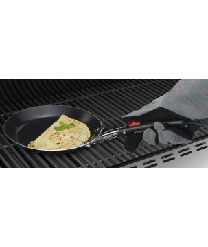 The Weber Style Pancake Pan is part of a range of cookware designed for use with the Universal Handle. The Weber Cookware System Pancake Pan is ideal for cooking up pancakes and omelettes on your Weber grill or side burner. The range also includes a Frying Pan, Chesnut Pan, Wok and Saucepan. The pans are cast aluminium with a ceramic coating which creates the non-stick surface. Although created for use on your Weber barbecue, each pan is also suitable for use on all types of kitchen hobs, even induction, plus they are really easy to clean. Universal Handle, a revolutionary detachable pan handle allowing you to cook with pans on your barbecue, leave them on the grill and close the barbecue lid without handles melting or getting too hot to handle. The heat resistant, nylon universal handle can be purchased separately. It has a zinc alloy functional gripping part which follows the contours of each pan to ensure a perfect fit. It rests in the open position and can be squeezed together and locked into place to secure the pancake pan.